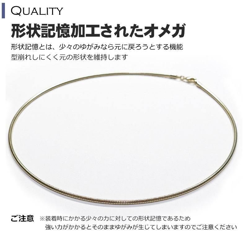 輝きの強さはロジウムメッキならでは。固めのオメガチェーンですので型崩れしにくいです。パーティーや結婚式などのフォーマルにも使えるオメガをどうぞ。